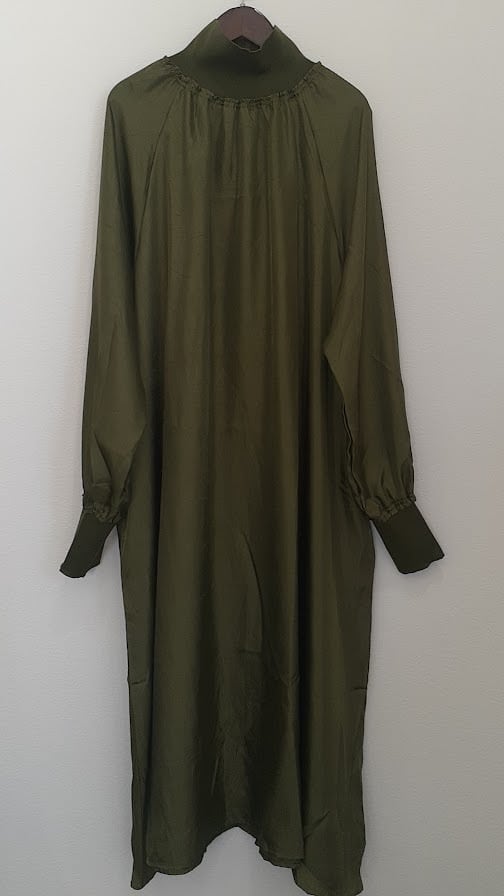 首元と袖口リブ使用でメリハリのあるシルエット。バックサテン生地にワッシャー加工を施した少し光沢感があるオシャレなワンピースです。また、落ち感がある生地の為着膨れして見えません。