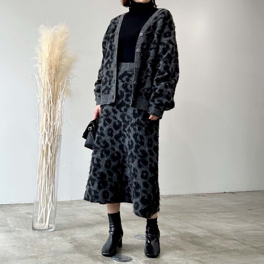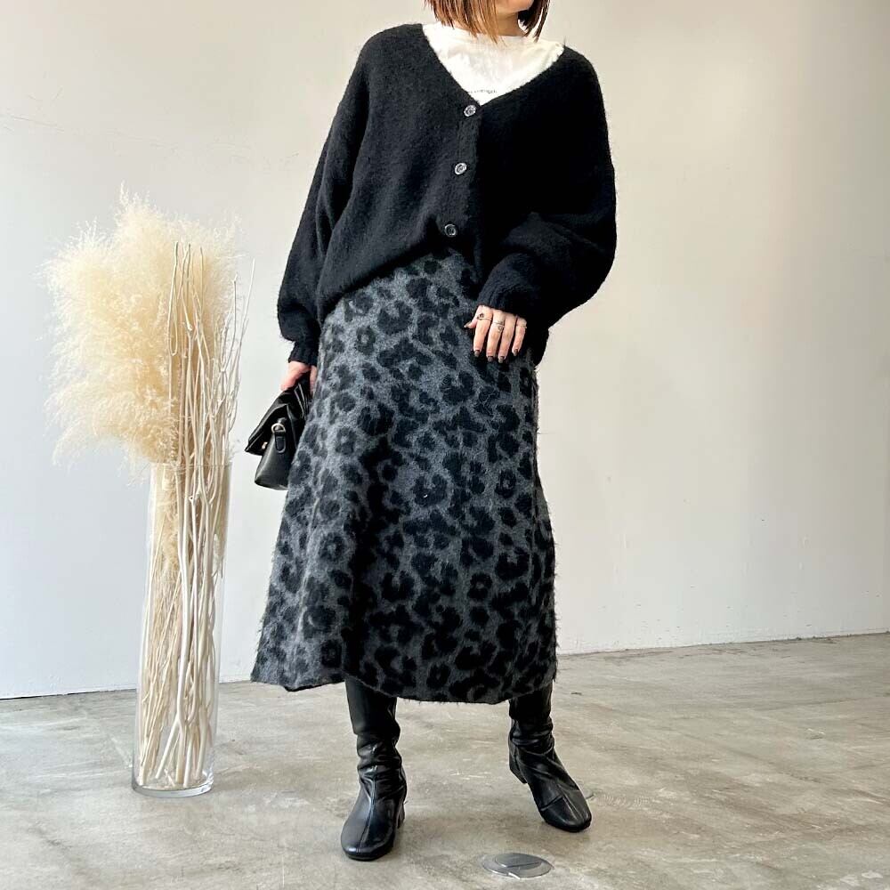 毛足のあるシャギー素材のニットスカートヒョウ柄がスタイリングのアクセントとして目を惹くアイテムこれからの季節に活躍するウォーム感のある起毛加工素材です◎程よいAラインで美しいシルエット◎