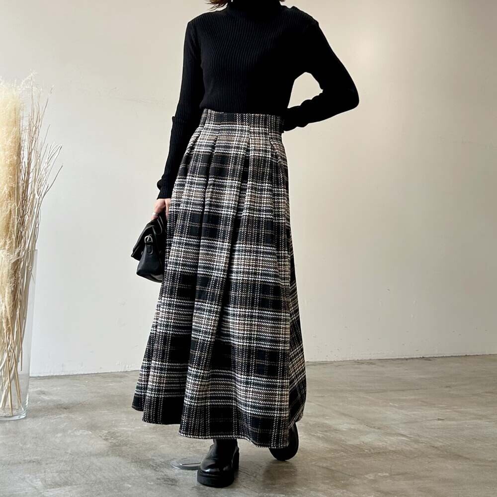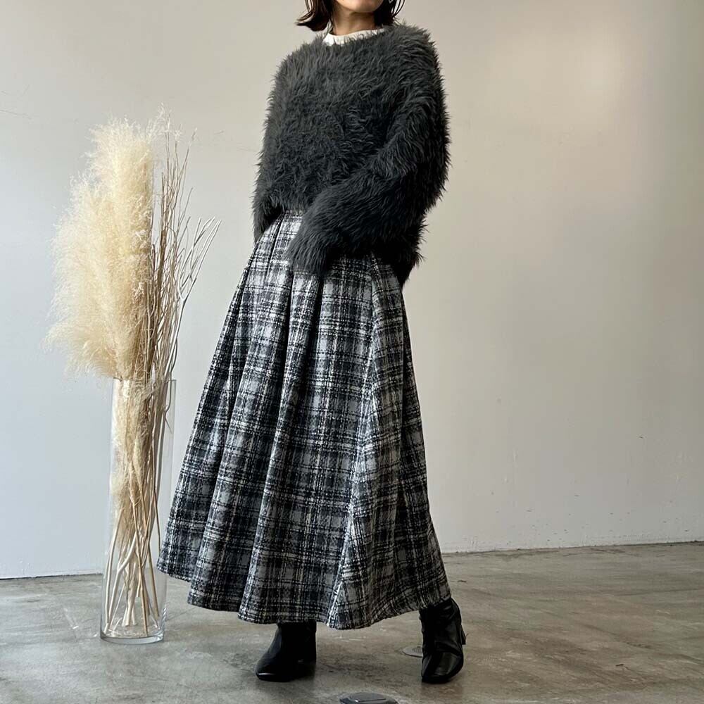 季節感のあるツイードチェック素材のスカートタック入りでウエスト周りはスッキリした見え方で裾に向けてフレア感のある上品なデザイン長めの丈感も嬉しいポイント◎